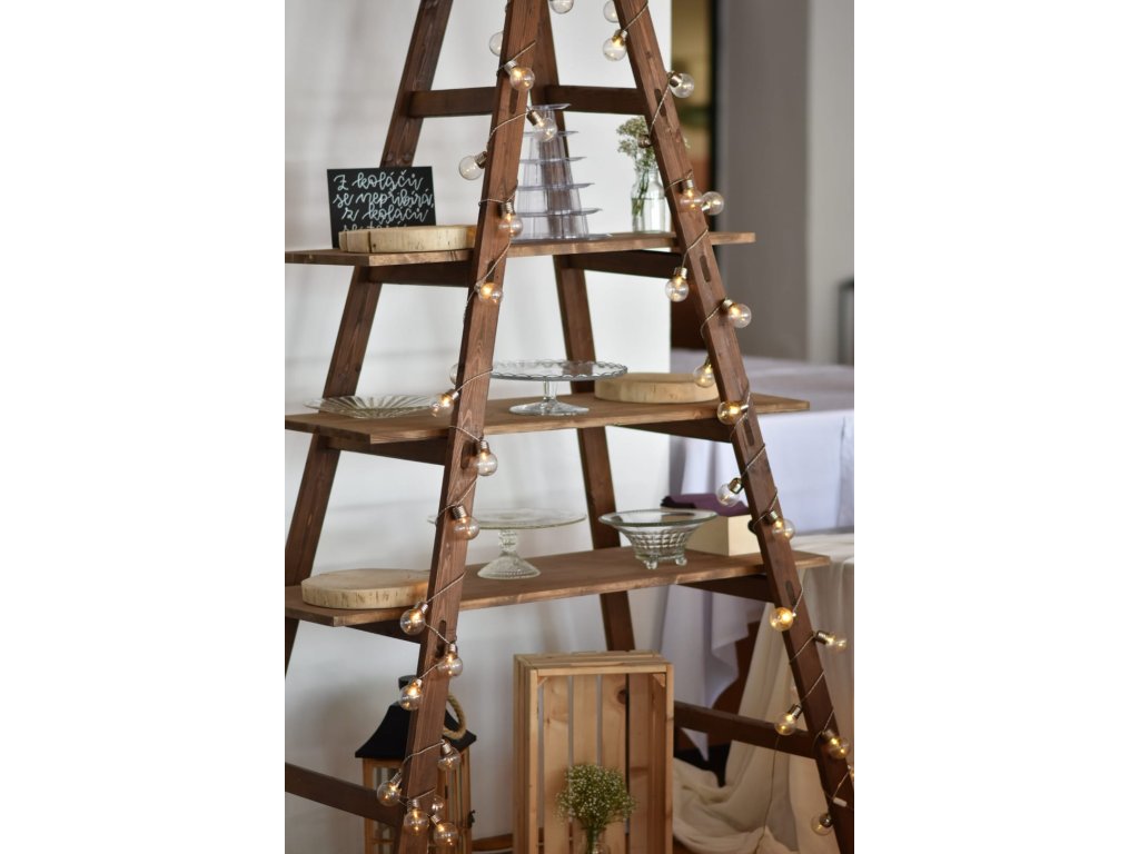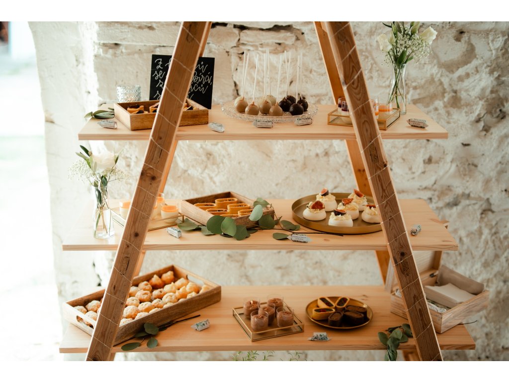 Dekorační žebřík s třemi policemi je originálním prvkem pro svatby, oslavy, večírky nebo firemní akce. Je ideální pro vystavení sladkostí, zákusků, cupcaků, ale také dekorací nebo drobných dárků pro hosty. Minimalistický design a přirozený vzhled z něj dělají elegantní doplněk jakéhokoliv prostoru.